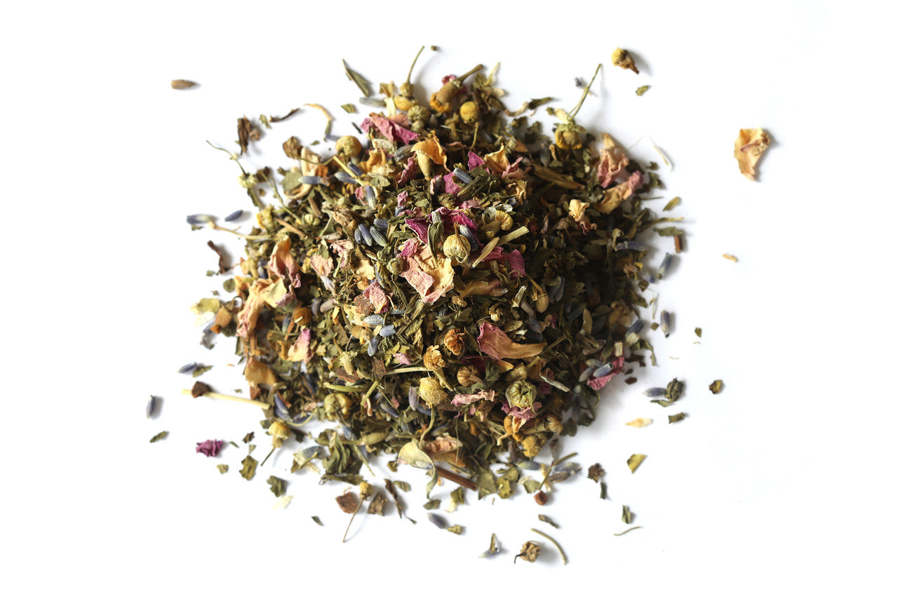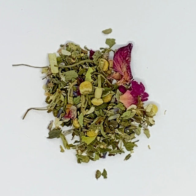 Organic chamomile flowers, organic spearmint, organic lavender flowers, organic cassia cinnamon bark, organic passionflower, and organic rose petals.